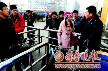 6日,濟(jì)南火車站實(shí)施進(jìn)站乘車100%實(shí)名驗(yàn)票制,票證信息不符將被拒絕進(jìn)站。圖為一名女乘客因信息不符被擋在站外! ”緢(bào)記者 周青先 攝