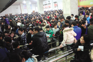 農(nóng)民工朋友回家一般會帶很多行李,進站時檢票會不會很麻煩?昨日,濟南站的工作人員告訴記者,春運期間檢票時會選擇在候車室內(nèi)抽查,不光是對農(nóng)民工,所有的旅客都這樣,以減少旅客的上車時間。