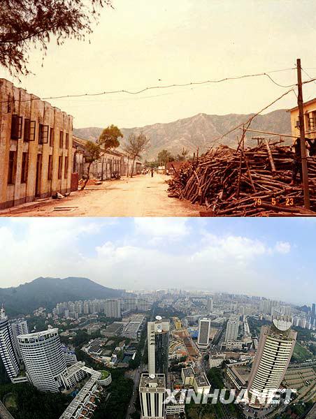 上圖:開發(fā)前的深圳蛇口老街(1979年5月23日攝)。下圖:高樓林立的深圳蛇口工業(yè)區(qū)(2008年10月10日攝)。1979年,中共中央作出了創(chuàng)辦經(jīng)濟(jì)特區(qū)的決策。以創(chuàng)辦經(jīng)濟(jì)特區(qū)為標(biāo)志,中國(guó)的對(duì)外開放邁出了重要步伐。 新華社發(fā)(資料圖片)