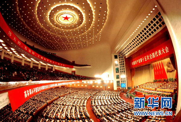 1997年9月12日至18日,中國(guó)共產(chǎn)黨第十五次全國(guó)代表大會(huì)在北京召開(kāi)。圖為開(kāi)幕式會(huì)場(chǎng)。