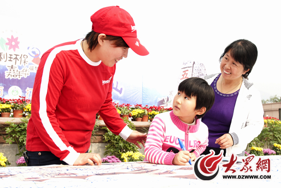 安利環(huán)保嘉年華泰安站志愿者武建新為參與簽名承諾的市民講解環(huán)境保護的重要性