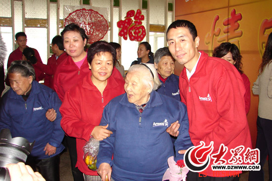 濟(jì)寧福利院情暖夕陽安利志愿者尚均、馮秀云攙扶老人進(jìn)入聯(lián)歡會場