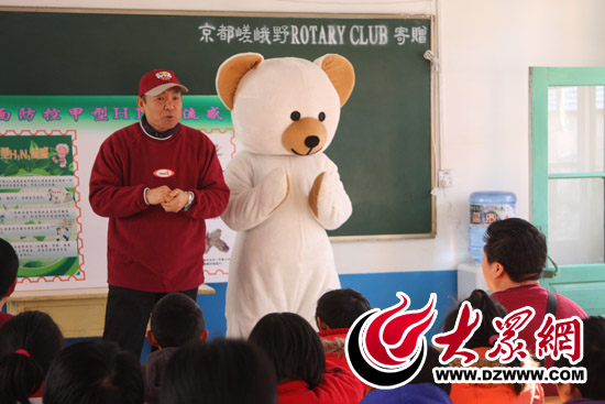 志愿者馬站英(左)、侯召亮(右)在濟南劉家慈安小學(xué)和小朋友們互動