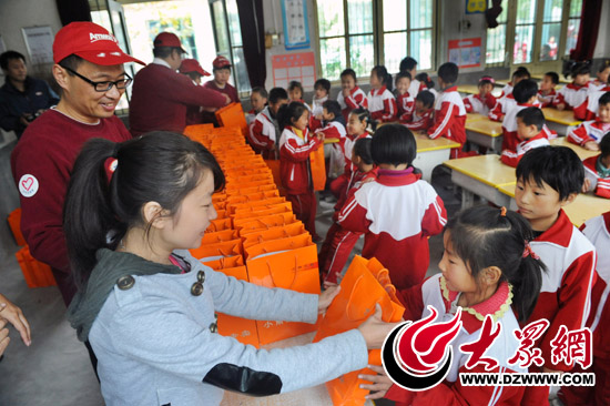 志愿者討俊嶺為仲宮穆家小學一年級同學發(fā)放文具
