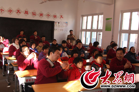 志愿者徐磊(左一)、韓紅偉(右一)和濟(jì)南劉家慈安小學(xué)的小朋友們演示洗手要領(lǐng)