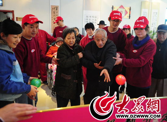 雖然行動不便,老人在安利志愿者的攙扶下還是順利的把球投了進去