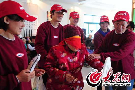 志愿者們你攙我扶,協(xié)助老人一起貼鼻子