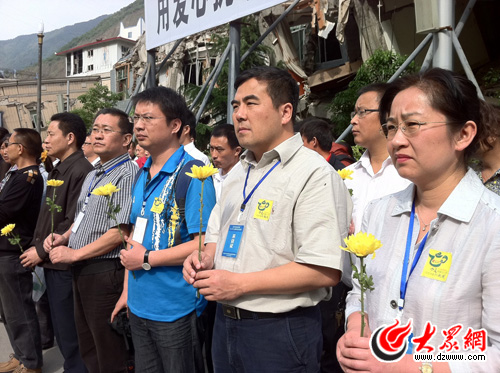 大眾網(wǎng)北川快訊(特派記者 李冉 馮煒程 趙爾印 盛堃)今天上午9時許,在北川老縣城,來自北川的黨政機關(guān)代表和社會各界群眾舉行公祭活動!敖裣脑俸缺贝ú琛鄙綎|愛心企業(yè)購茶團代表參加活動,并為“5·12”汶川特大地震遇難同胞獻上鮮花。