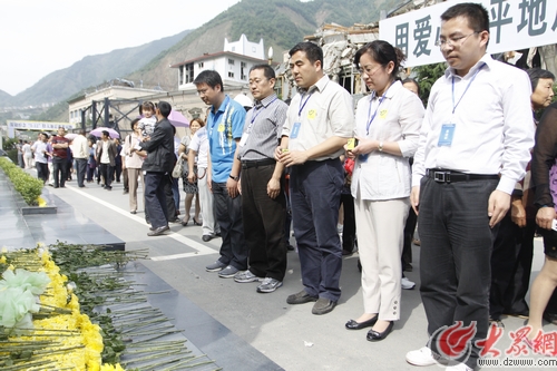 山東愛心企業(yè)代表在“5.12”大地震遇難者紀念碑前致哀。從左至右為:農(nóng)業(yè)銀行山東分行題召棟、山東省體育彩票管理中心何珊、大眾網(wǎng)副總編姜長勇、中國建設(shè)銀行山東省分行于福貴、山東省體彩管理中心朱華品