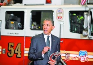 當(dāng)?shù)貢r(shí)間5日,美國(guó)總統(tǒng)奧巴馬前往紐約世貿(mào)中心遺址參加紀(jì)念活動(dòng)前,先到一處消防站看望消防員并發(fā)表講話。