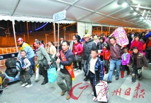 昨晚8時50分,琶洲異地候乘點開始轉(zhuǎn)運春運首趟列車旅客。 記者 陳安 攝