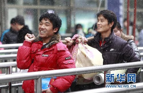 1月18日,兩名安徽籍在滬打工人員冒雪步入車站乘車 新華社發(fā)