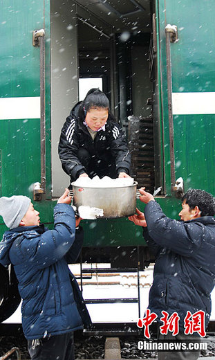 1月18日,一場大雪突降江西九江等地,江西贛北地區(qū)大雪紛飛,一片銀白,江西境內(nèi)的鐵路部門做好車輛防斷檢修和餐車食品供應(yīng)工作,確保人們出行安全暢通。圖為工作人員正在風(fēng)雪中往客車上運送餐料食品。胡國林 攝