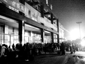 凌晨4時,記者趕到宏基長途客運站,站內(nèi)候車室、售票大廳燈火通明,里面卻是空蕩蕩的;站外卻是一片黑壓壓人群,大約有一千多人。在寒風(fēng)中被車站拒之門外,他們和陶輝一樣,已經(jīng)挨凍等了一個多小時,最長的等了近3個小時。