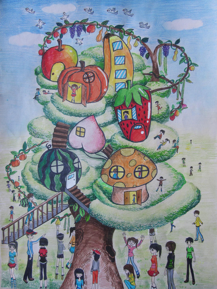 壽光是蔬菜之鄉(xiāng),兩幅漫畫作品都與蔬菜有關(guān),《空中果蔬樂園》表現(xiàn)了小朋友們喜歡的綠色而環(huán)保的一個(gè)果蔬公園。《一起去種菜》表現(xiàn)了小朋友一起去勞動(dòng),最后種植出無公害的新鮮蔬菜,體驗(yàn)了勞動(dòng)帶來的快樂!
