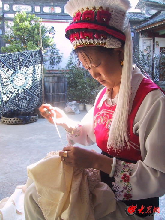 大眾網-聯(lián)通3G大理10月4日訊(特派記者 王磊)10月4日,“黨旗漫卷中國紅——走進56個民族家庭”采訪團離開麗江,來到中國最大的一個白族村大理市周城村采訪。一千年前,“三道茶”文化從這里開啟。上世紀60年代,電影《五朵金花》讓這里被世人熟知。如今,能到這里買一塊扎染布成了當?shù)芈糜蔚男聲r尚。改革開放以來,大理白族人不僅用一塊布開啟了他們的致富路,而且那些用圖案拼起的白族故事正通過一塊塊扎染布為世人熟知。