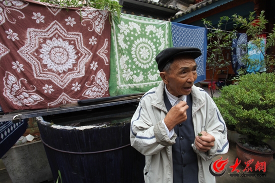 在晾曬扎染布的院子里,段紹升向我們詳解扎染工藝。
