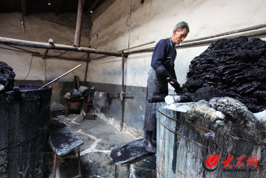 在染坊,工人們將扎好的圖案的布進行染色。