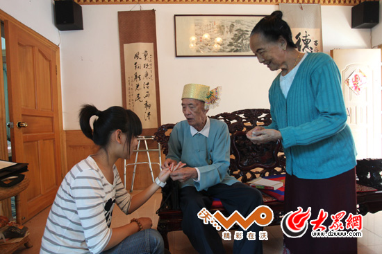 老州長為小記者施哲瑩拴線。拴線是版納傣族人至高的一種禮節(jié),包含所有美好的祝福。