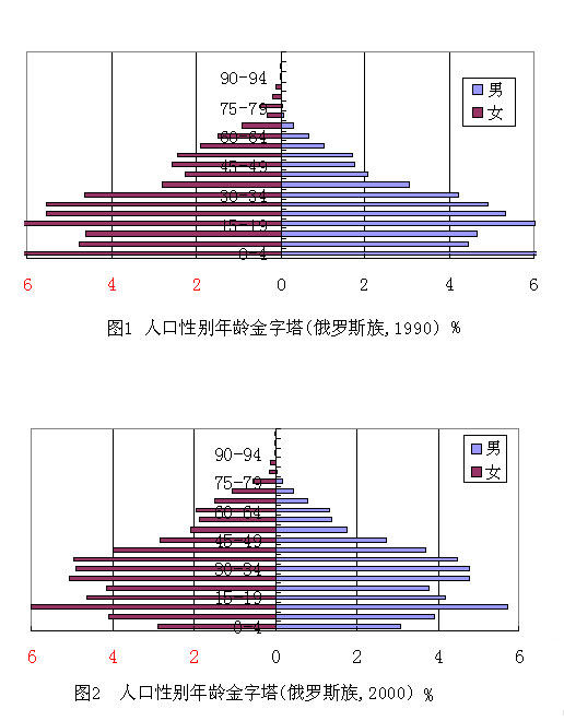 從各年齡段的人口比例看,少年兒童人口(0-14歲)比重為25.69%,勞動(dòng)年齡人口(15-64歲)比重為69.44%,老年人口(65歲及以上)占4.87%,與1990年相比,少年兒童人口比重下降了5.57個(gè)百分點(diǎn),勞動(dòng)年齡人口比重和老年人口比重分別增加了3.20和2.37個(gè)百分點(diǎn)。1990年和2000年俄羅斯族人口的性別年齡結(jié)構(gòu)如圖1和圖2所示。