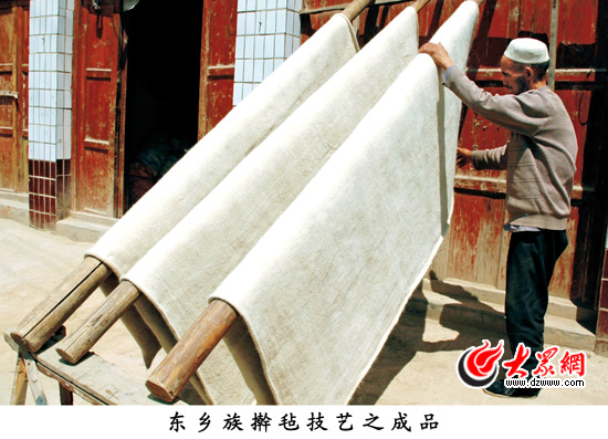 “咱們東鄉(xiāng)族有什么樣的有民族特色的東西嗎?”記者把這樣一個問題拋給陪同采訪的東鄉(xiāng)縣宣傳部副部長黃德文和縣文化局局長馬忠華。兩人思索半天說:“我們的‘東鄉(xiāng)手抓羊肉’是我們東鄉(xiāng)的品牌,其它的就沒大有了! 手抓羊肉在蒙古族、維吾爾族、回族等民族中也有,讓它作為一個有50多萬人口的民族識別標志似乎讓人并不那么認同。“我們東鄉(xiāng)族的搟氈被列入國家非遺,但現(xiàn)在沒大有人做這個了,面臨失傳的危險!瘪R忠華說。