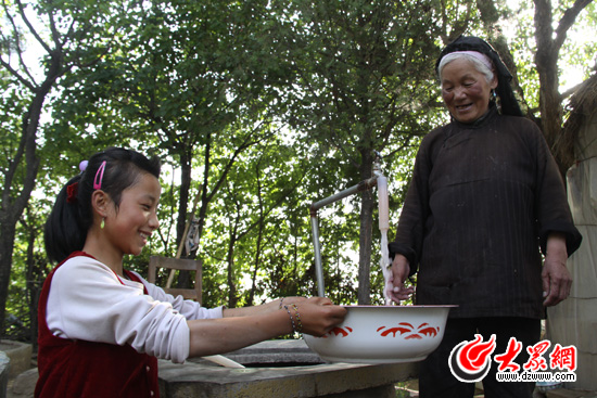 東鄉(xiāng)縣劉家村的村頭,13歲的東鄉(xiāng)族女孩阿英社正在自家門口的水池假山旁,和奶奶一起準(zhǔn)備接水飲羊。阿英社拿出自家樹上結(jié)的山杏怯生生的遞到記者手中,旁邊的老奶奶聽說是來看水的,跟記者感嘆起來,“以前人和羊喝的是水窖里的‘刷街水’,現(xiàn)在有了自來水,再把水窖水端給羊喝,羊都不喝了!毕癜⒂⑸缂乙粯佑蒙献詠硭鉀Q吃水難的已經(jīng)有13萬人,已經(jīng)接近28萬人口的一半。