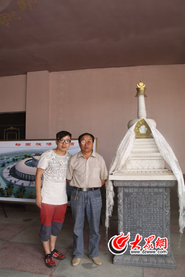 記者和裕固族安定王后裔安吉祥在他捐助的裕固族歷史紀(jì)念塔前合影留念。