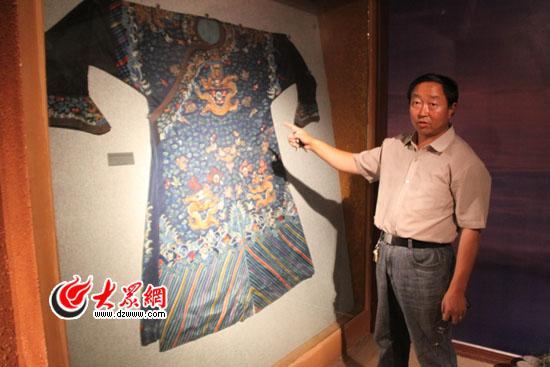 “我爺爺叫安貫布什加,是裕固族的七族總王大頭目,也是裕固族最后一個(gè)大頭目!痹谠9套宀┪镳^,安吉祥指著展柜里陳列的一件天藍(lán)色龍袍對(duì)記者說,爺爺安貫布什加就曾穿過這件龍袍出席族里的重大節(jié)日。