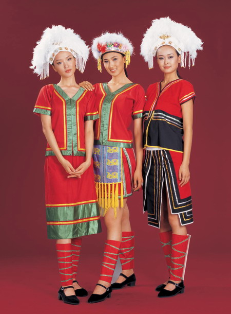 1、泰雅、賽夏、曹、阿美地區(qū)的女子多穿對襟長袖上衣,配腰裙,戴護腿。泰雅、賽夏的女子穿單裙,朱歐女子穿左右雙合裙。排灣、阿美女子穿長裙。布衣、排灣、魯凱女子用黑、紅布纏頭,外箍彩繡頭帶,穿大襟衣,右衽,左右開衩都很高,配褲子。雅美女子穿背心,圍腰布,冬天用方布圍裹,并在左肩打結。大陸的高山族女子穿對襟衣,內(nèi)有胸襯,配筒裙,頭戴紅或紫色軟布花環(huán)。喜慶日子里高山族男女都穿盛裝,其衣裙褲帶五彩斑駁,腿部和衣物上佩戴貝珠、料珠、銀、骨、羽毛等飾品,有的還穿珠裙、貝衣等。