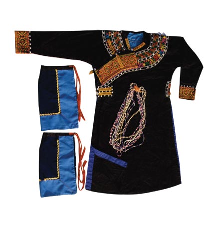 2、以布農(nóng)、魯凱和排灣人為主的長衣下裳式:其特點為上身穿窄袖上衣,在袖與肩的部位有滾邊的刺繡,下穿圍裙膝褲,以黑布或紅布纏頭,跣足。