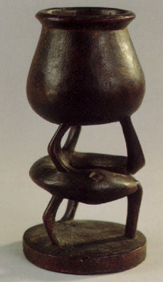 這是用整塊木料雕成的一個(gè)杯子,情趣盎然。它上面是一個(gè)小杯,底座和杯身間刻著一條蛇,形成一個(gè)透空,似乎蛇在撐地托杯,構(gòu)思奇特。