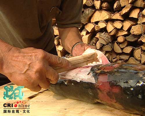 隨后尤文鳳用鐵刀把魚(yú)皮上殘留的魚(yú)肉一一清理干凈,將魚(yú)皮貼在門上風(fēng)干,這要一夜時(shí)間才行。經(jīng)過(guò)一晚上,門板上已經(jīng)風(fēng)干的魚(yú)皮硬得象塊板子,這樣的硬度是絕對(duì)不可能作為衣料的,風(fēng)干的魚(yú)皮要怎么才能變得柔軟如絲絨一樣呢?
