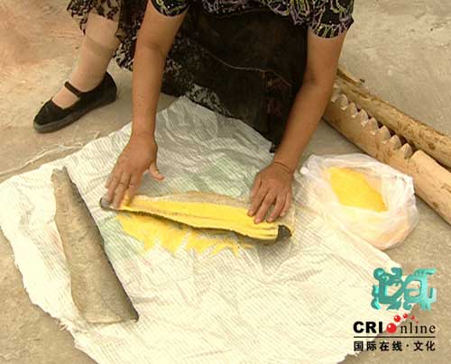 魚(yú)皮包上玉米面后就放在剛才的鍘刀上扎壓。鍘刀是木制的,上下有鋸齒,魚(yú)皮在鋸齒間被翻轉(zhuǎn)壓扎,而裹在魚(yú)皮里的玉米面這時(shí)就會(huì)發(fā)揮它獨(dú)到的作用了。扎皮子這活得兩個(gè)人干,是個(gè)體力活,辛苦活,記者干了十分鐘就汗流浹背了,尤文鳳說(shuō),軋皮子的時(shí)候就得找年輕有勁的小伙子,要是十來(lái)張皮子放到一塊,得扎半個(gè)小時(shí),兩個(gè)小伙子每人只扎十五分鐘,都累得夠嗆。