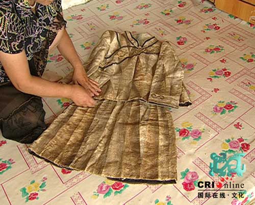 早先的赫哲人沒(méi)有棉麻織物,只有魚(yú)皮獸皮,因此聰慧的赫哲人發(fā)明了用魚(yú)皮制衣的技藝。但是,制作魚(yú)皮衣的傳統(tǒng)正在一點(diǎn)點(diǎn)的改變著?p制魚(yú)皮衣的棉線是現(xiàn)在才使用的,赫哲人最早沒(méi)有棉花,因此所有的制衣原料都來(lái)自漁獵中可以得到的物品。從小小棉線的使用,到漁獵生活的遠(yuǎn)去,赫哲人的生活改變得如此巨大,魚(yú)皮衣再也不會(huì)出現(xiàn)在赫哲人的日常生活中了。
