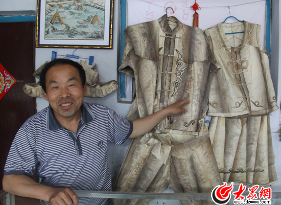 孫玉林向記者介紹自己制作的魚皮衣,兩件魚皮衣要用上數十條大馬哈魚的魚皮。