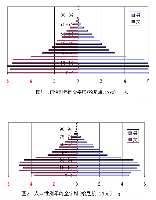 從各年齡段的人口比例看,少年兒童人口(0-14歲)比重為27.76%,勞動(dòng)年齡人口(15-64歲)比重為67.58%,老年人口(65歲及以上)占4.66%,與1990年相比,少年兒童人口比重下降了8.90個(gè)百分點(diǎn),勞動(dòng)年齡人口比重和老年人口比重分別增加了8.12和0.78個(gè)百分點(diǎn)。1990年和2000年哈尼族人口的性別年齡結(jié)構(gòu)如圖1和圖2所示。