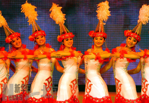 中央民族歌舞團(tuán)在北京大紅門國(guó)際服裝節(jié)和諧華夏民族服裝展演會(huì)上表演哈薩克族女子舞蹈。 新華社記者王呈選攝