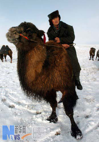 11月2日,新疆阿勒泰地區(qū)富蘊(yùn)縣的哈薩克族牧民哈孜別克騎著駱駝走在轉(zhuǎn)場(chǎng)途中。