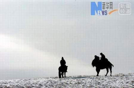 11月2日,新疆阿勒泰地區(qū)富蘊(yùn)縣的兩名哈薩克族牧民在轉(zhuǎn)場(chǎng)途中守望自己的羊群。