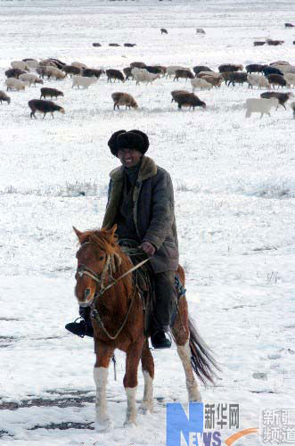 11月2日,新疆阿勒泰地區(qū)富蘊(yùn)縣的哈薩克族牧民阿肯爾在風(fēng)雪中放羊。