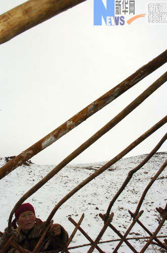 11月2日,新疆阿勒泰地區(qū)富蘊(yùn)縣的哈薩克族牧民米拉正在搭建轉(zhuǎn)場(chǎng)途中的氈房。