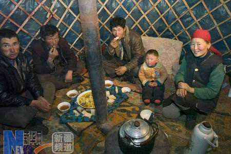 11月2日,新疆阿勒泰地區(qū)富蘊(yùn)縣的哈薩克族牧民米拉(右一)、哈拉(右三)和親戚朋友在剛搭好的氈房里吃晚飯。