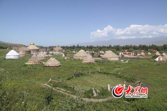 “草原部落”景區(qū)里還原的古烏孫國(guó)場(chǎng)景,散落著大大小小的白色氈房。