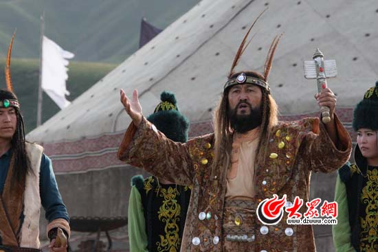 吐?tīng)柡箘e克扮演烏孫國(guó)法師。他的身后是重達(dá)三點(diǎn)六噸的天鍋,一次可煮40只羊