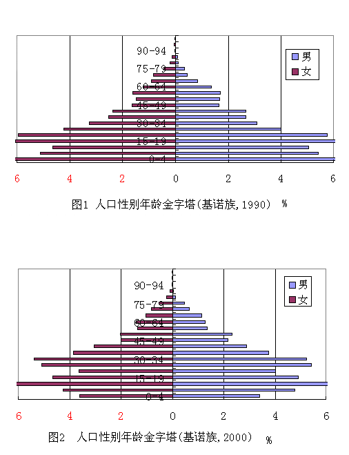 從各年齡段的人口比例看,少年兒童人口(0-14歲)比重為28.87%,勞動(dòng)年齡人口(15-64歲)比重為65.89%,老年人口(65歲及以上)占5.24%,與1990年相比,少年兒童人口比重下降了5.15個(gè)百分點(diǎn),勞動(dòng)年齡人口比重和老年人口比重分別增加了4.34和0.81個(gè)百分點(diǎn)。1990年和2000年基諾族人口的性別年齡結(jié)構(gòu)如圖1和圖2所示。