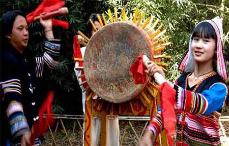 基諾族的大鼓長約1米左右,直徑在四、五十厘米之間,兩面蒙有牛皮,平時禁止敲擊,只有在過特懋克節(jié)和祭祀稱為"鐵羅嫫嫫"的神靈時,方能敲擊大鼓和跳大鼓舞。