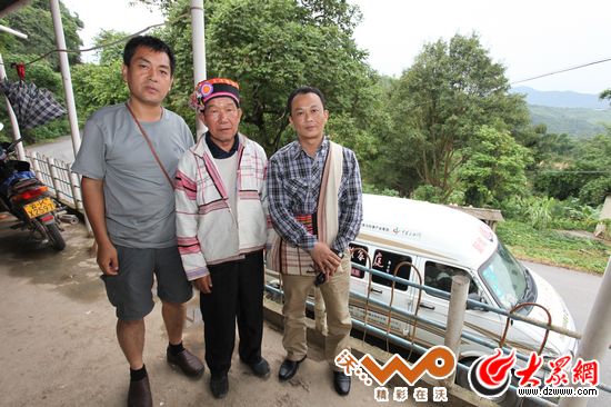 施曉亮與沙車?yán)先、景洪市委宣傳部外宣辦主任張?jiān)。張(jiān)埔彩菑幕Z山走出去的基諾娃娃,他對(duì)自己民族的文化保護(hù)也有著深深的憂思