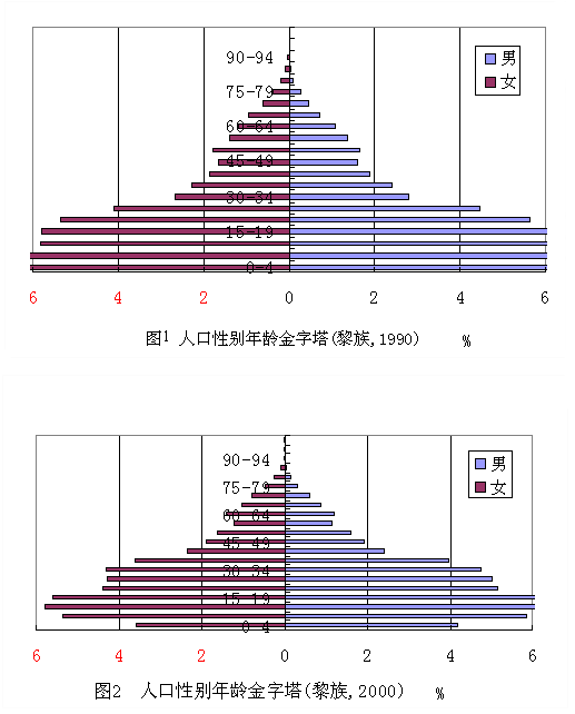 從各年齡段的人口比例看,少年兒童人口(0-14歲)比重為31.09%,勞動年齡人口(15-64歲)比重為64.14%,老年人口(65歲及以上)占4.77%,與1990年相比,少年兒童人口比重下降了7.83個百分點,勞動年齡人口比重和老年人口比重分別增加了6.93和0.90個百分點。1990年和2000年黎族人口的性別年齡結(jié)構(gòu)如圖1和圖2所示。