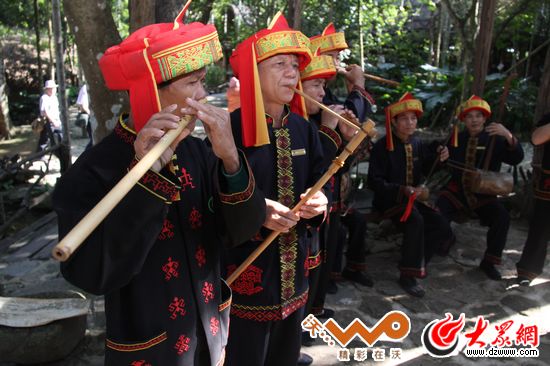 海南保亭的檳榔谷中還有一只演奏黎族竹木樂器的演奏隊(duì),樂手全是周邊村寨的黎族村民。