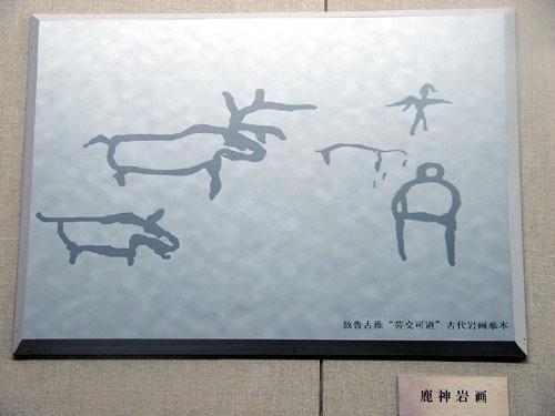 馴鹿巖畫,在大興安嶺安娘娘河流域保拉坎和克坡河的交嘮呵道的巖石上,有兩處鄂溫克族先人留下的馴鹿巖畫。巖畫中有鹿、鳥(niǎo)、持弓箭的獵人等圖案。